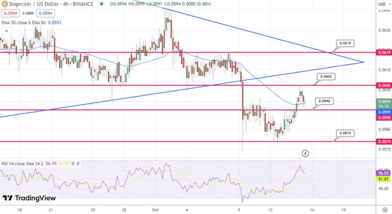 Meanwhile, the 50-Day Exponential Moving Average (50 EMA) stands at $0.05930, suggesting a bullish trend since Dogecoin’s price is slightly above this figure.