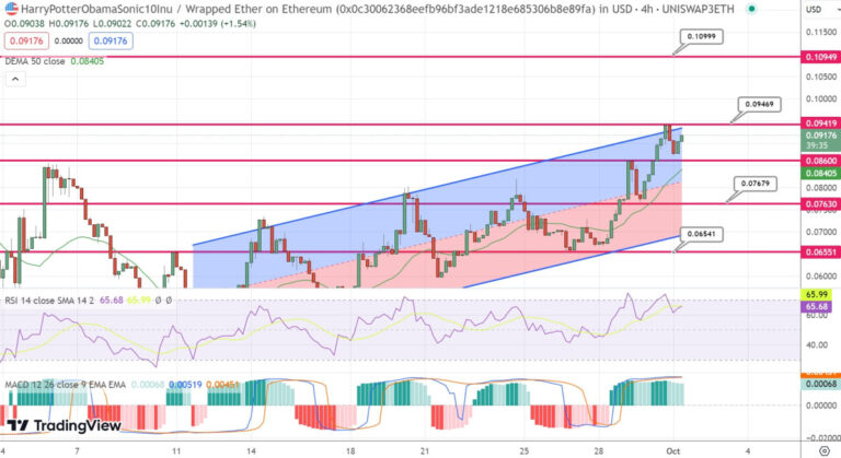 From a technical vantage point, the pivotal price for this coin is marked at 0.07582. HarryPotterObamaSonic10Inu (BSC) currently faces immediate resistance at 0.10965. This is trailed by resistances at 0.12839 and 0.17967.