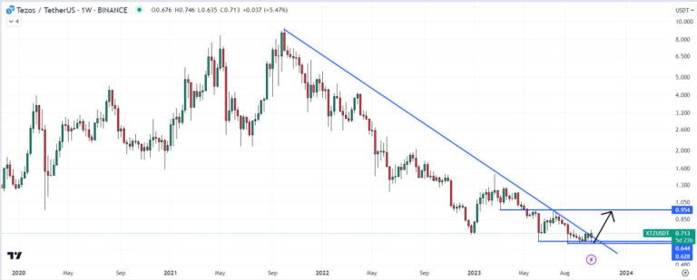 XTZ appeared to break an important trendline dating all the way back to late 2021 on Monday, which could have potentially triggered some technical buying.