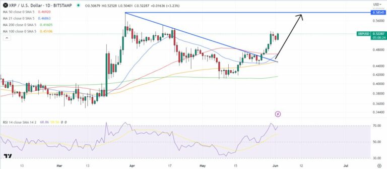 Chart analysis suggests that XRP remains on course to retest its yearly highs in the $0.58 area.