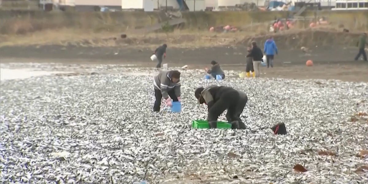 - About 1,200 tons of fish washed up on a beach in Hakodate, Japan, per AP.