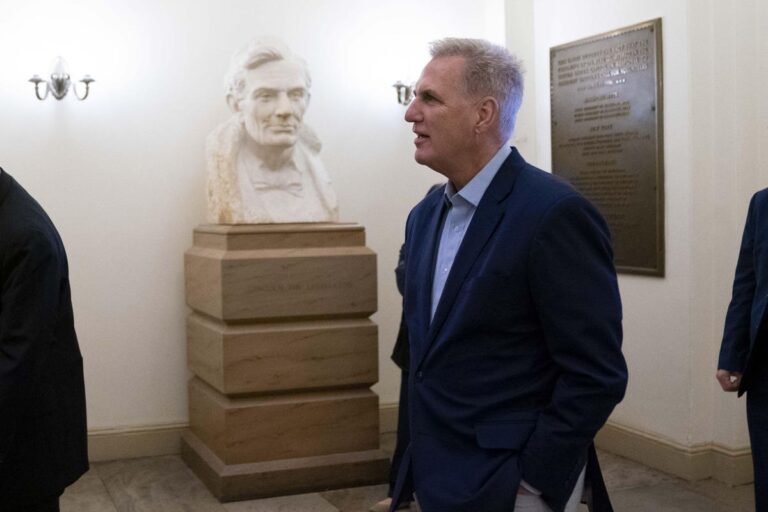 US House Speaker Kevin McCarthy, a Republican from California, speaks to members of the media at the … [+]