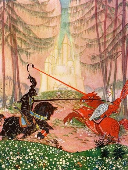 Sir Gareth, Knight of the Round Table, defeats the Red Knight at jousting, from the Arthurian … [+]