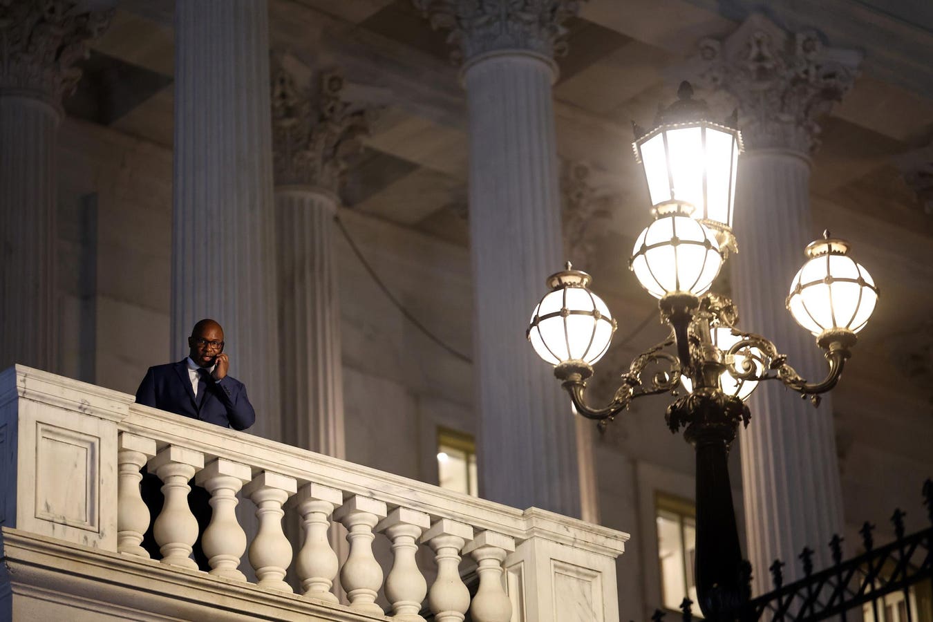 WASHINGTON, DC – NOVEMBER 14: U.S. Rep. Jamaal Bowman (D-NY) takes a phone call as he leaves the … [+]