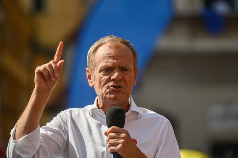 WARSAW, POLAND – JUNE 04: The Leader of opposition party, Civil Platform, Donald Tusk delivers a … [+]