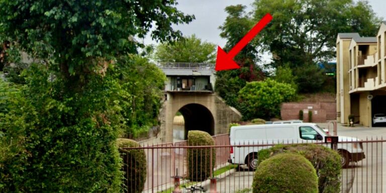 When you’re standing on the road, all you can see are the railings on the roof of the apartment — making it seem like the house is underneath the bridge.