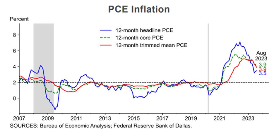 The chart at the top of this blog shows the downtrends now apparent in the Personal Consumption Expenditure (PCE) Price Indexes. And, while Thursday’s monthly Consumer Price Index (CPI) report (+0.4% month/month) disappointed, it was an improvement over August (+0.6%), and the closely watched year/year inflation rate remained at +3.7% in September, same as August. “Core” inflation (less food and energy) came in as anticipated at +0.3% month/month and at +4.1% on a 12-month look back. That number was +4.3% in August. This is the lowest the “Core” has been since October 2021! Unfortunately, the index variant that the Fed watches closely, Core Services less Rents, came in hot at +0.6% month/month in September. Thankfully, the year/year calculation fell to +3.8% in September from +4.0% in August.