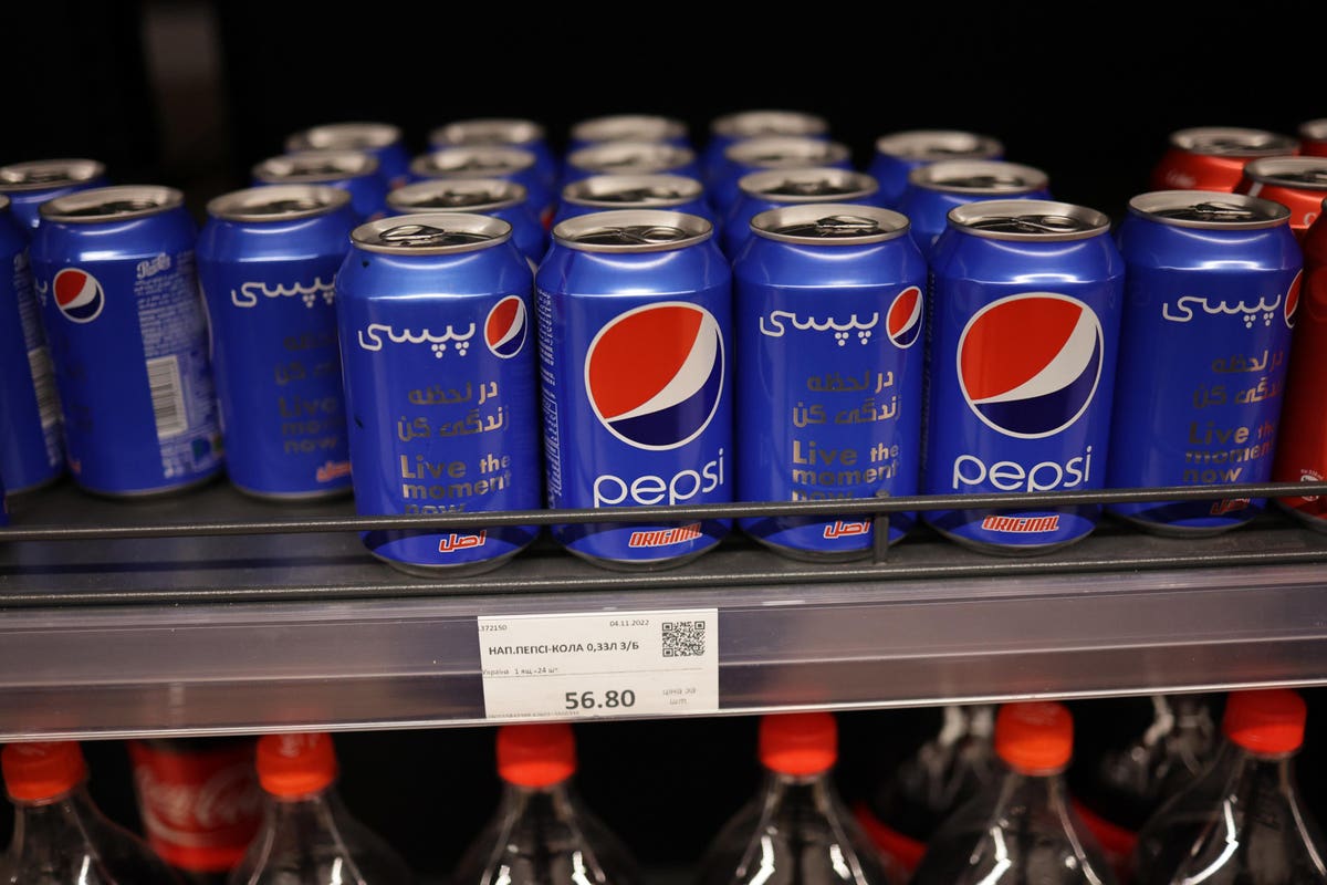KHERSON, UKRAINE – NOVEMBER 13: Pepsi tin cans on the shelves in the supermarket on November 13, … [+]