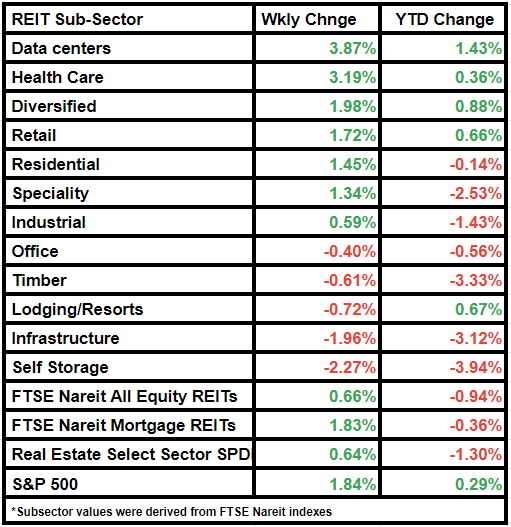 Data centers and Health Care were the top gainers among subsectors, having risen by more than 3% this week. Diversified REITs also saw a notable gain, an average of 1.98%.