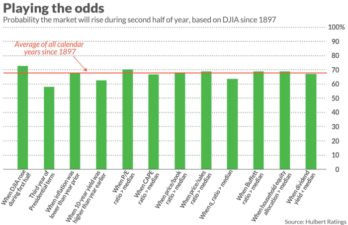 The odds were identical a year ago, when the stock market was sporting a big year-to-date loss, inflation was higher, interest rates were lower and it was the second year of the presidential term. The Dow rose 7.7% over the subsequent six months.