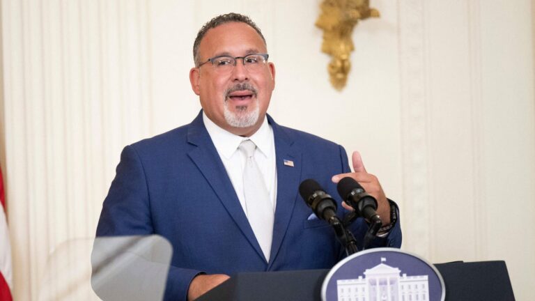 US Education Secretary Miguel Cardona speaks in the East Room of the White House in Washington, DC, … [+]