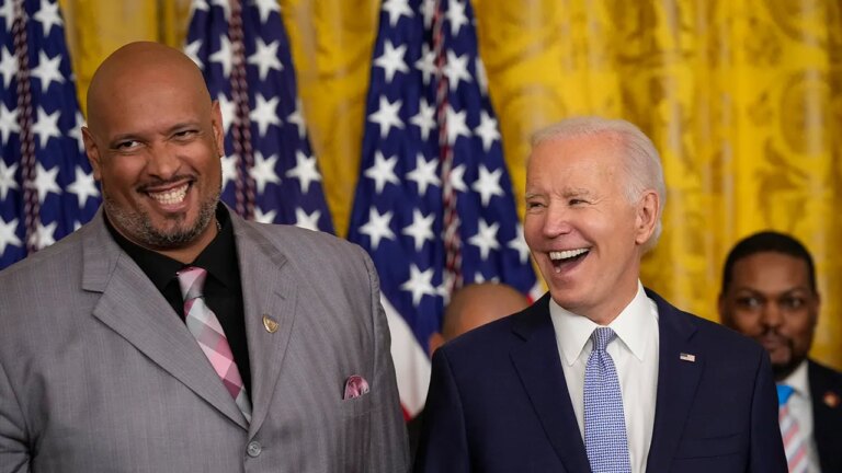 President Biden and Capitol Police Officer Harry Dunn share a laugh before Biden presented him with a Presidential Citizens Medal during a White House ceremony to mark the two-year anniversary of the U.S. Capitol riot on Jan. 6, 2023. (Drew Angerer/Getty Images)