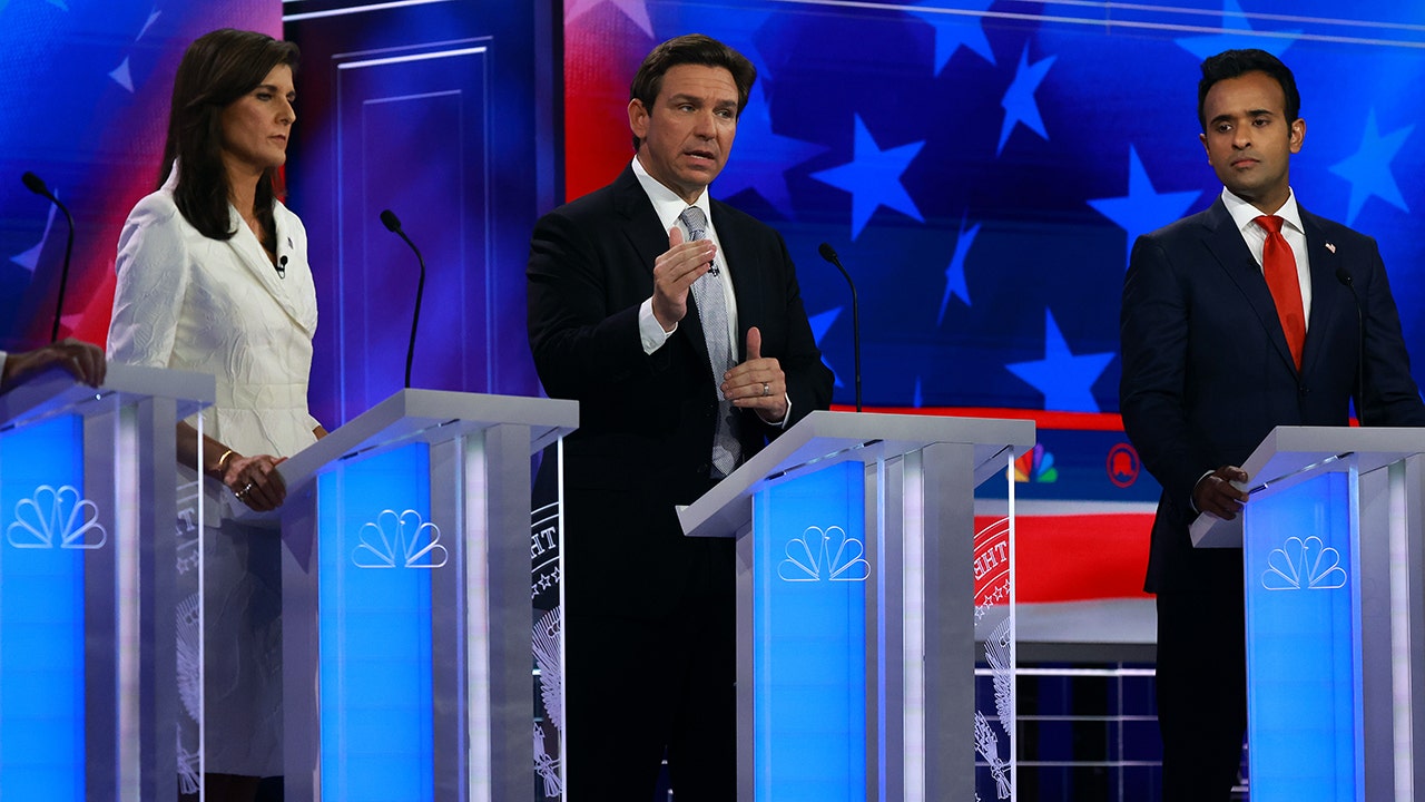 Republican presidential candidate Florida Gov. Ron DeSantis, center, speaks alongside former U.N. Ambassador Nikki Haley and Vivek Ramaswamy during the NBC News Republican Presidential Primary Debate at the Adrienne Arsht Center for the Performing Arts of Miami-Dade County on Nov. 8, 2023 in Miami. (Joe Raedle/Getty Images)