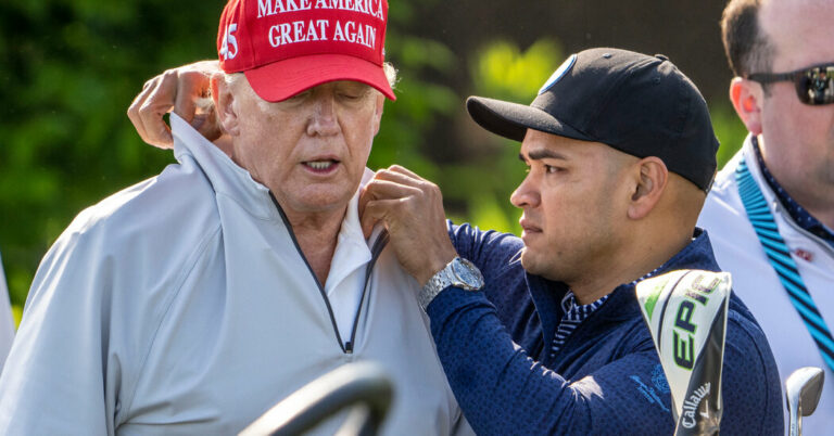 On May 25, as former President Donald J. Trump was at the Saudi-backed LIV golf tournament at his course in Sterling, Va., one of his aides was photographed leaning toward him and dutifully adjusting the collar of his white pullover, a moment of closeness that had become routine for the pair.