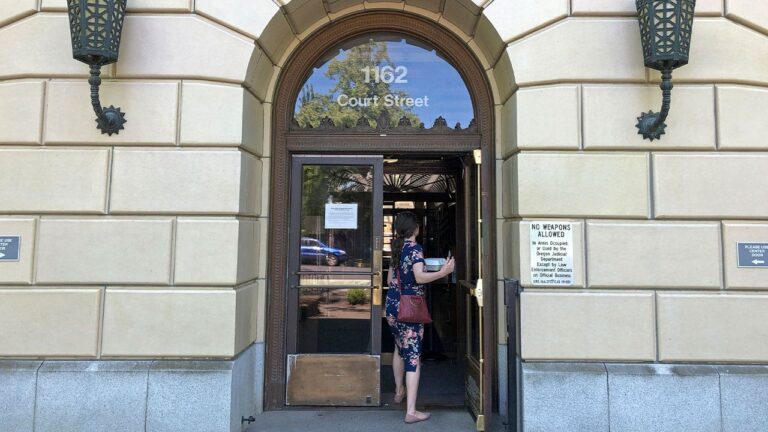 A woman enters the Oregon Department of Justice building in Salem, Oregon, on May 28, 2020. (AP Photo/Andrew Selsky, File)
