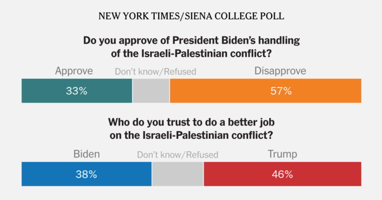 Voters between 18 and 29 years old, traditionally a heavily Democratic demographic, jump out. Nearly three quarters of them disapprove of the way Mr. Biden is handling the conflict in Gaza. And among registered voters, they say they would vote for Mr. Trump by 49 percent to 43 percent — in July, those young voters backed Mr. Biden by 10 percentage points.