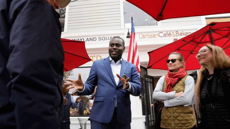 Gabe Amo, Rhode Island Democratic candidate for the U.S. House, center, greets people during a campaign stop at a cafe, Monday, Nov. 6, 2023, in Providence, R.I. (AP Photo/Steven Senne)