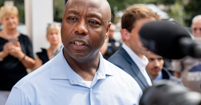 Senator Tim Scott of South Carolina said on Sunday that he would not support a request from President Biden to package aid for Israel, Ukraine and Taiwan and funding for border security, even though he has endorsed U.S. spending for each of those purposes.