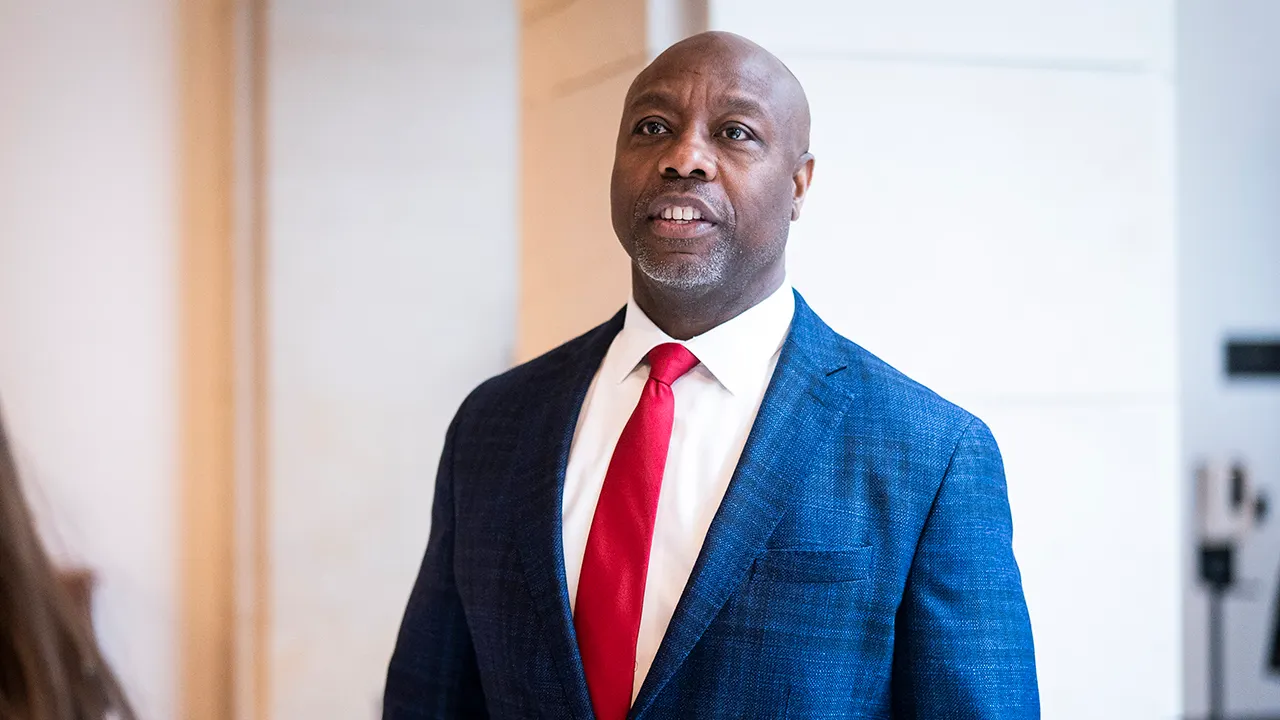 Sen. Tim Scott, R-S.C., arrives for a meeting with lawmakers and intelligence advisers regarding the Chinese surveillance balloon on Capitol Hill in Washington, D.C., on Feb. 9, 2023. (Jabin Botsford/The Washington Post via Getty Images)